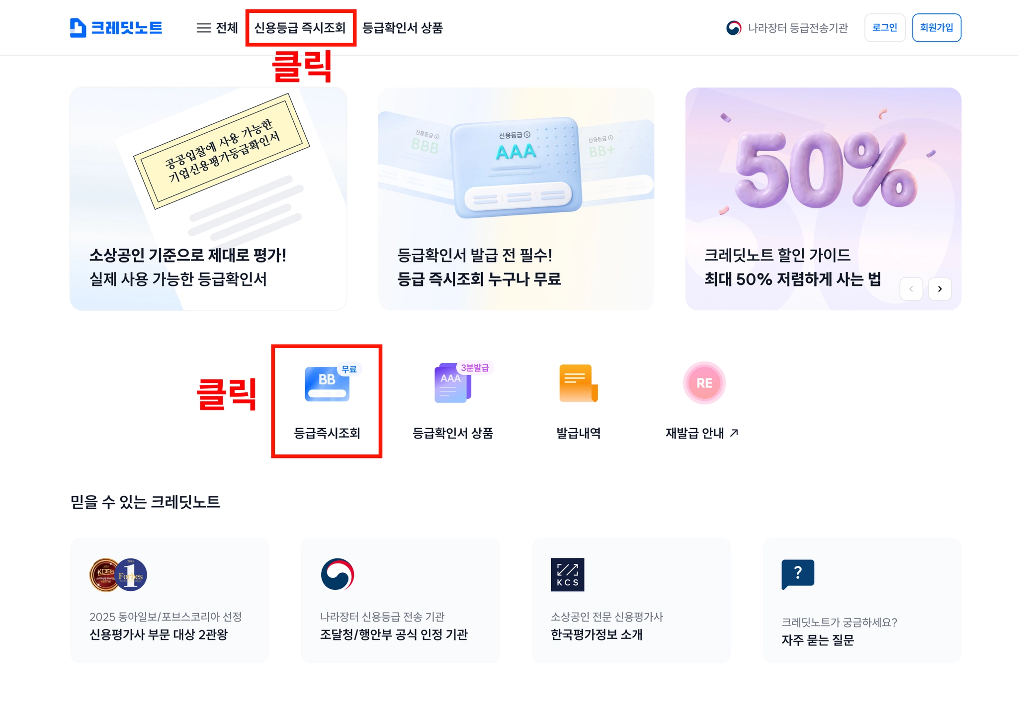 1. https://www.credit-note.co.kr/main 에 접속한 뒤 아래 중 한 곳을 클릭해 주세요.