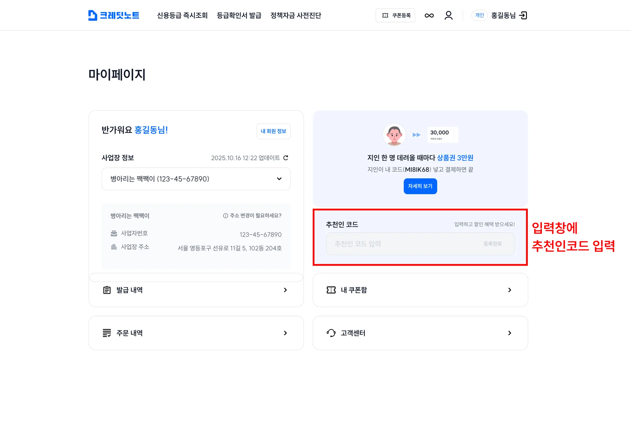 지인추천 이벤트는 추천인 등록 후, 등급확인서 구매까지 완료하셔야 정상적으로 응모됩니다.