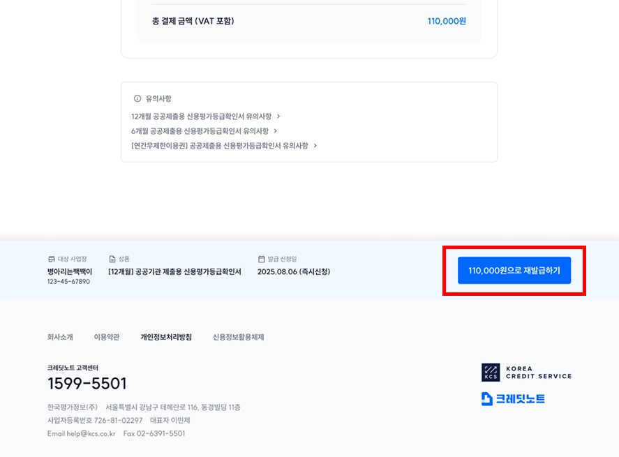 7. 상품과 발급일자 선택이 완료되었다면, 페이지 하단 재발급하기 버튼을 클릭하여 결제단계로 넘어가요.