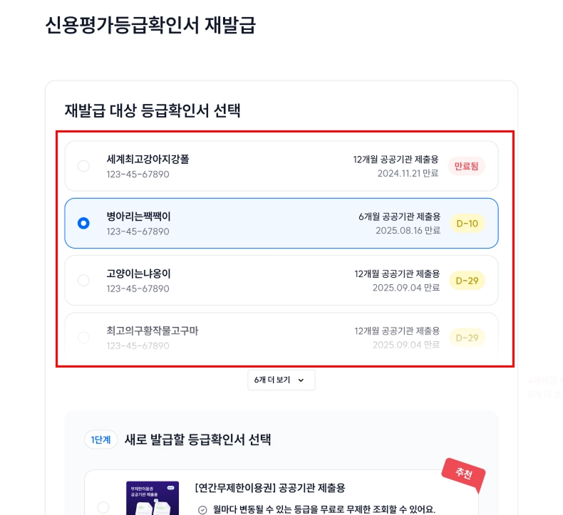 신용등급은 발급 시점 기준으로 산정됩니다. 만료일에 재발급을 선택하면 기존 등급확인서의 만료일 기준으로 신용등급이 산정되어 등급확인서가 발급됩니다.