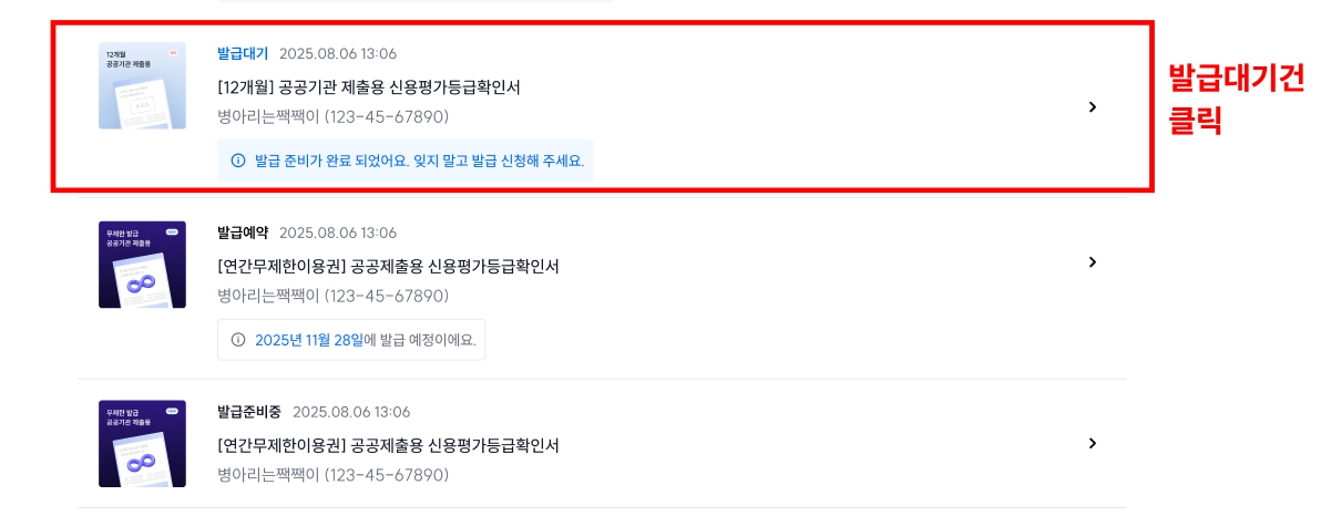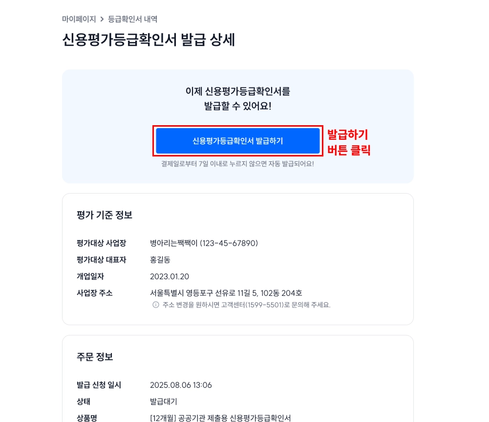 10. 파란색 “신용평가등급확인서 발급하기” 버튼을 클릭해주세요.