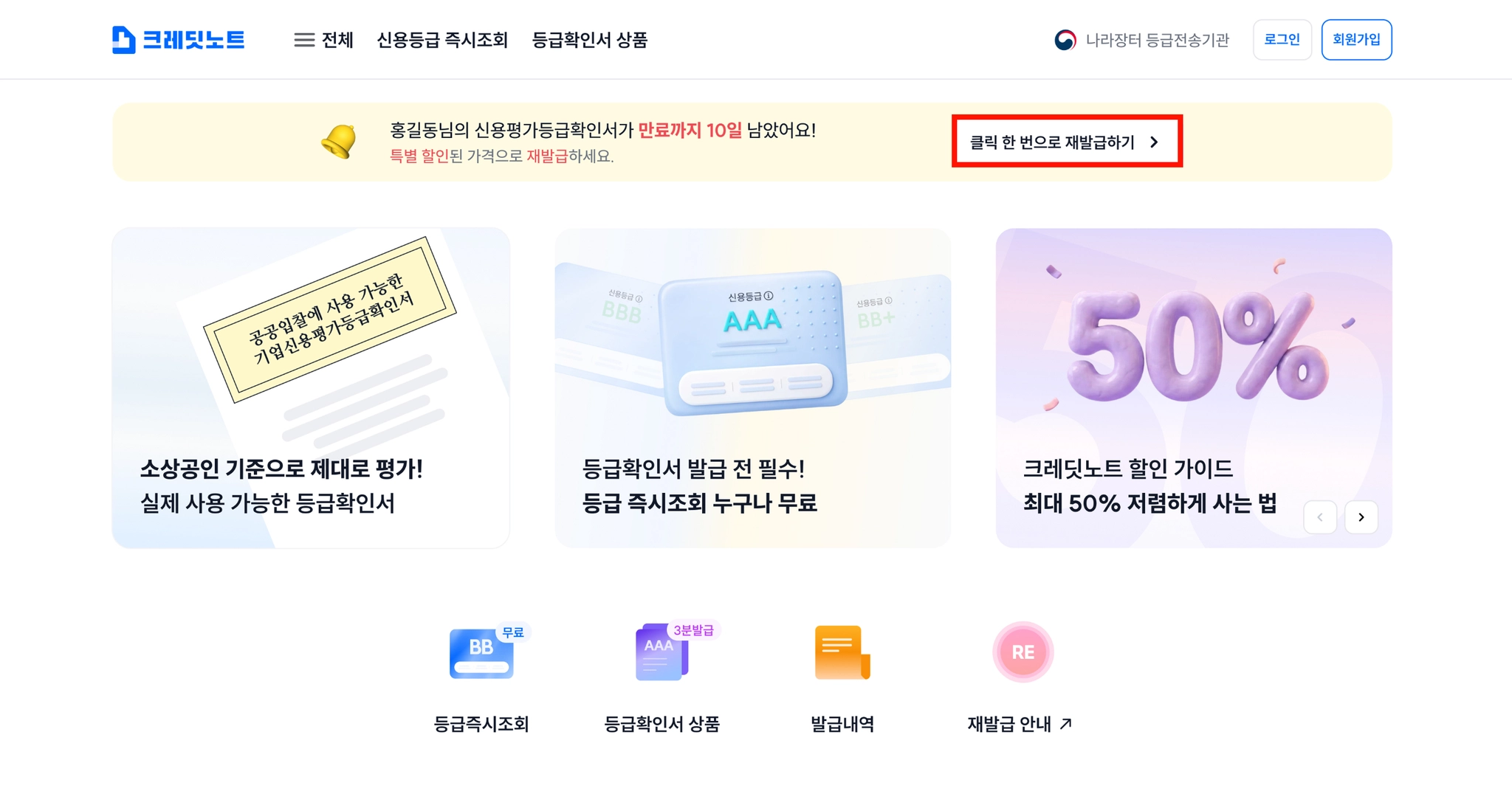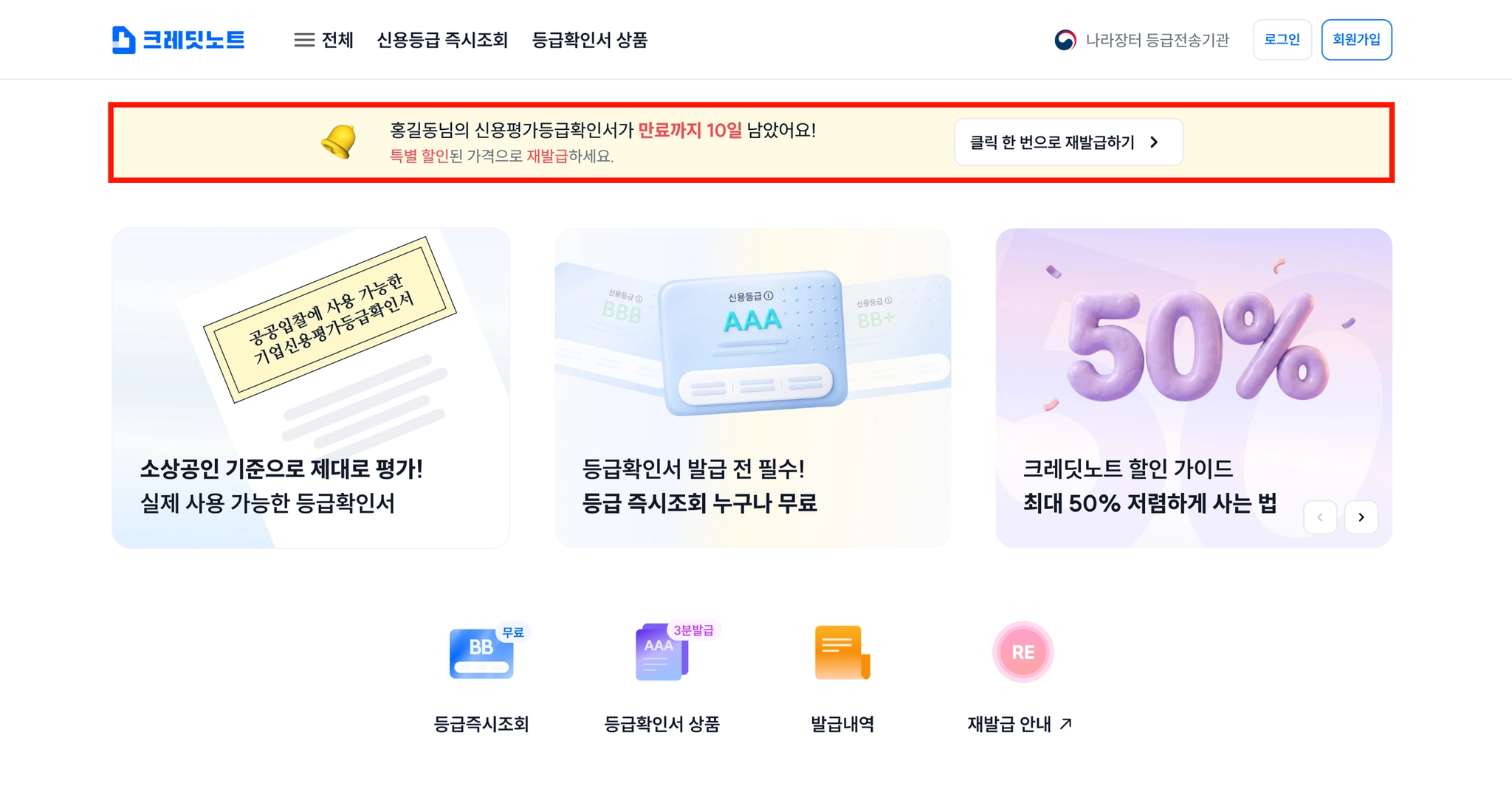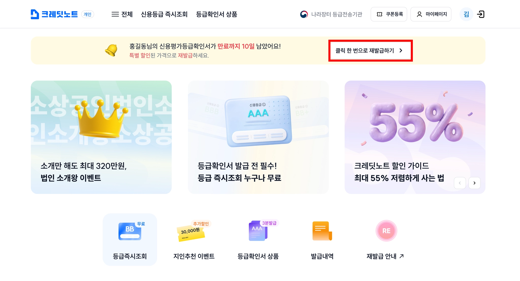 1. 등급확인서 만료까지 얼마 남지 않은 회원이라면 주목! 로그인을 한 상태로 크레딧노트 홈페이지에 접속했다면 아래 배너를 발견하실 수 있어요.
