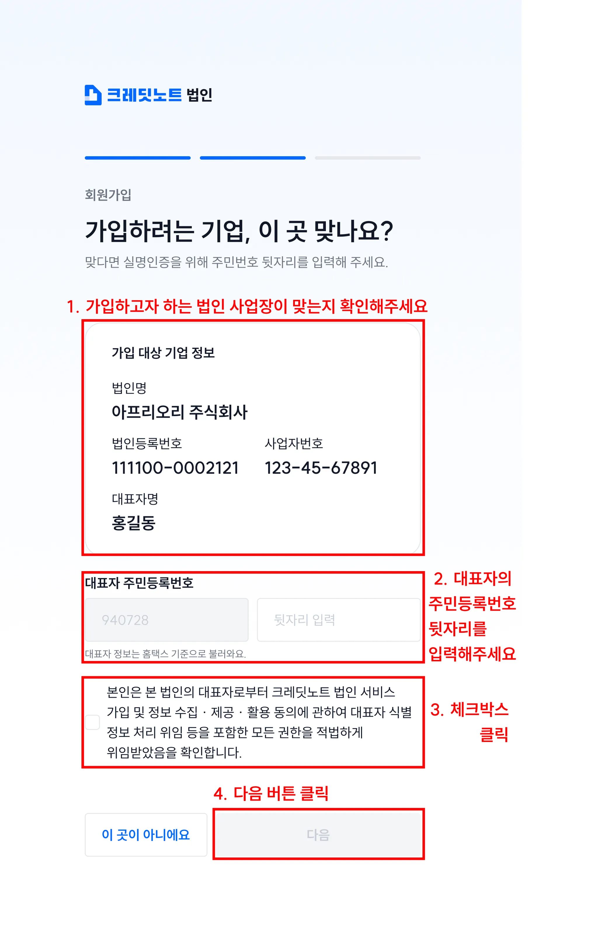 4. 법인 사업장 정보가 정확한지 확인한 후, 대표자의 주민등록번호를 입력해 주세요.