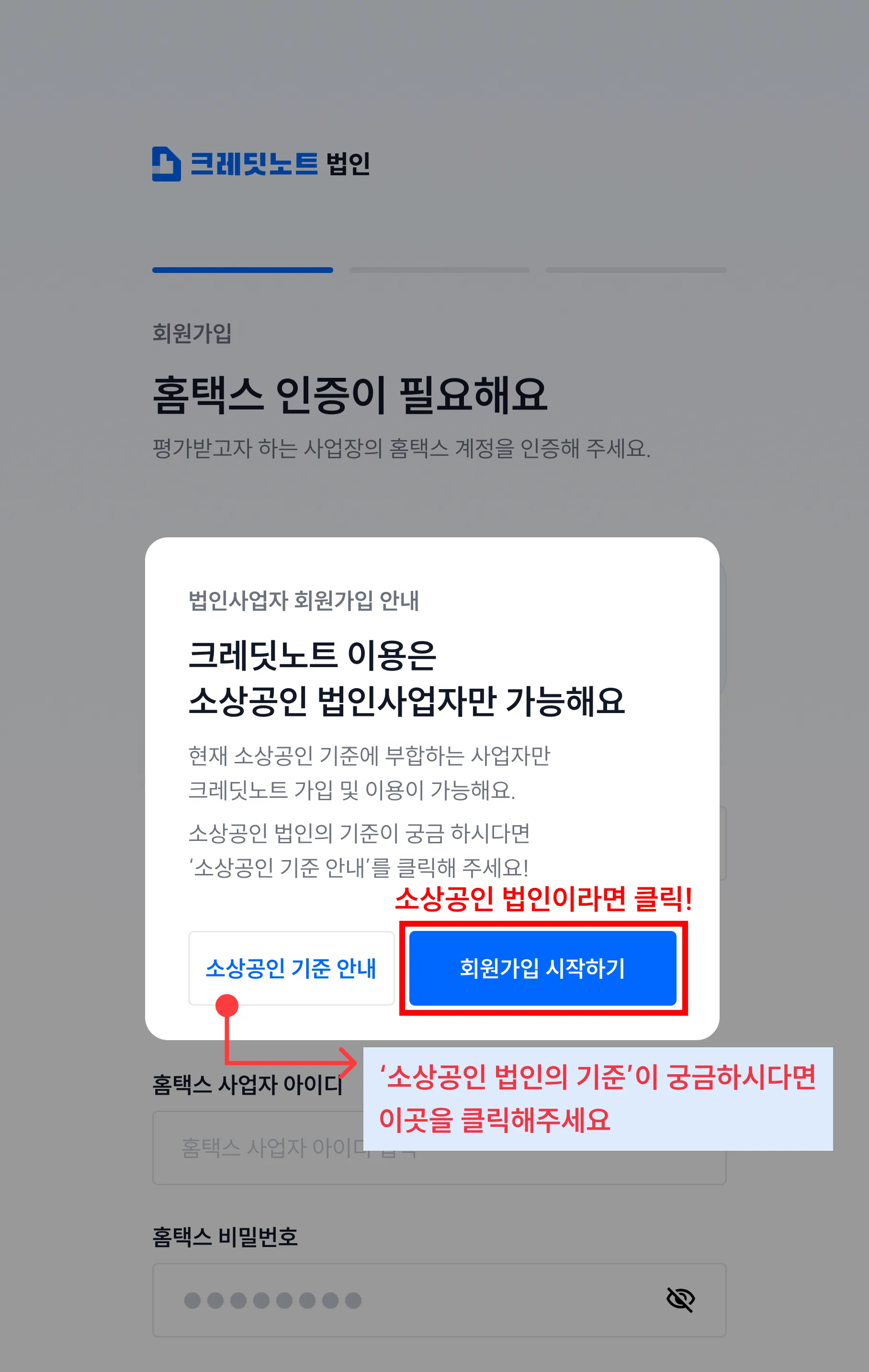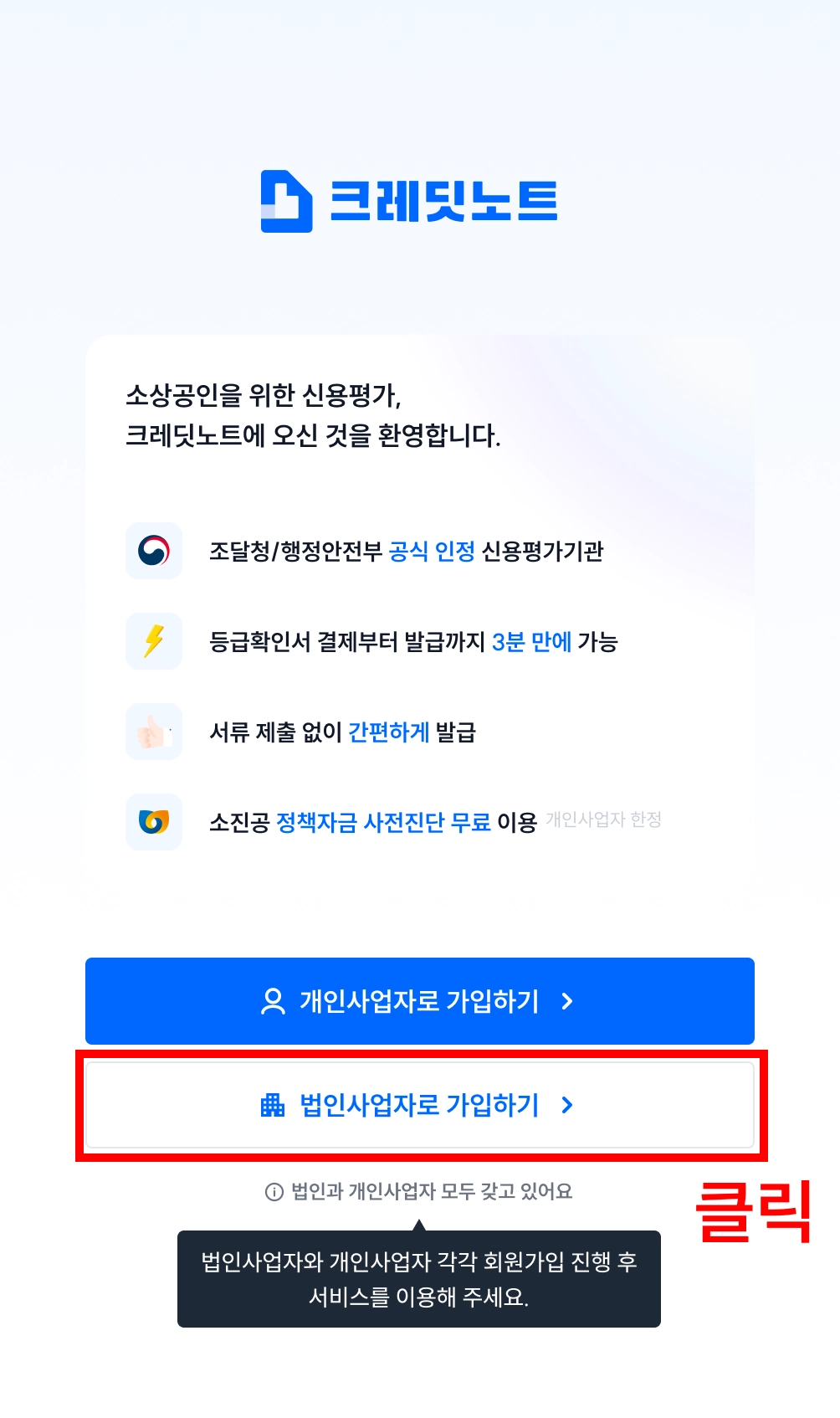 크레딧노트의 소상공인 법인사업자는 개인사업자와는 다른 절차로 회원가입이 진행됩니다