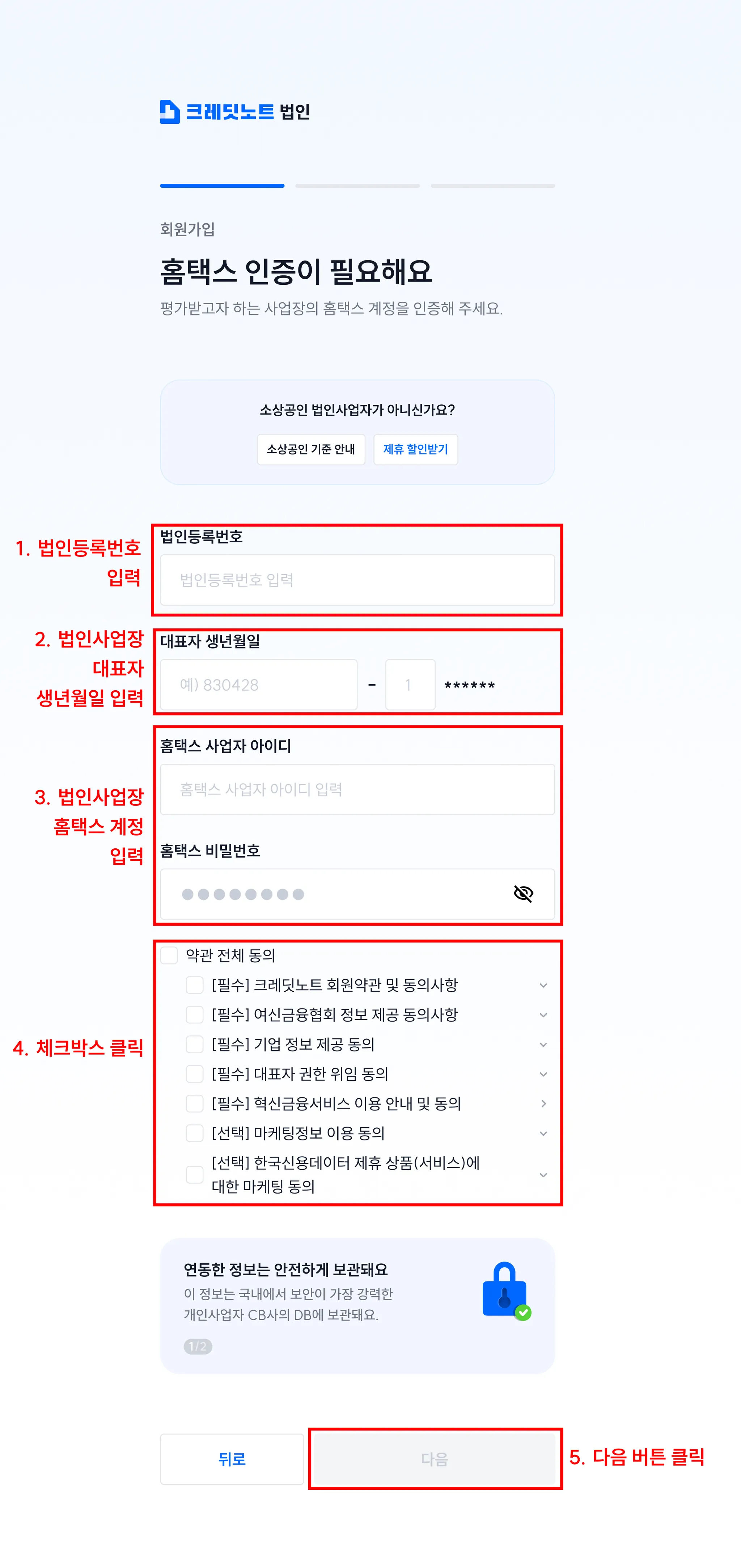 3. 등록하려는 법인 사업장의 홈택스 계정 정보를 입력해 주세요.