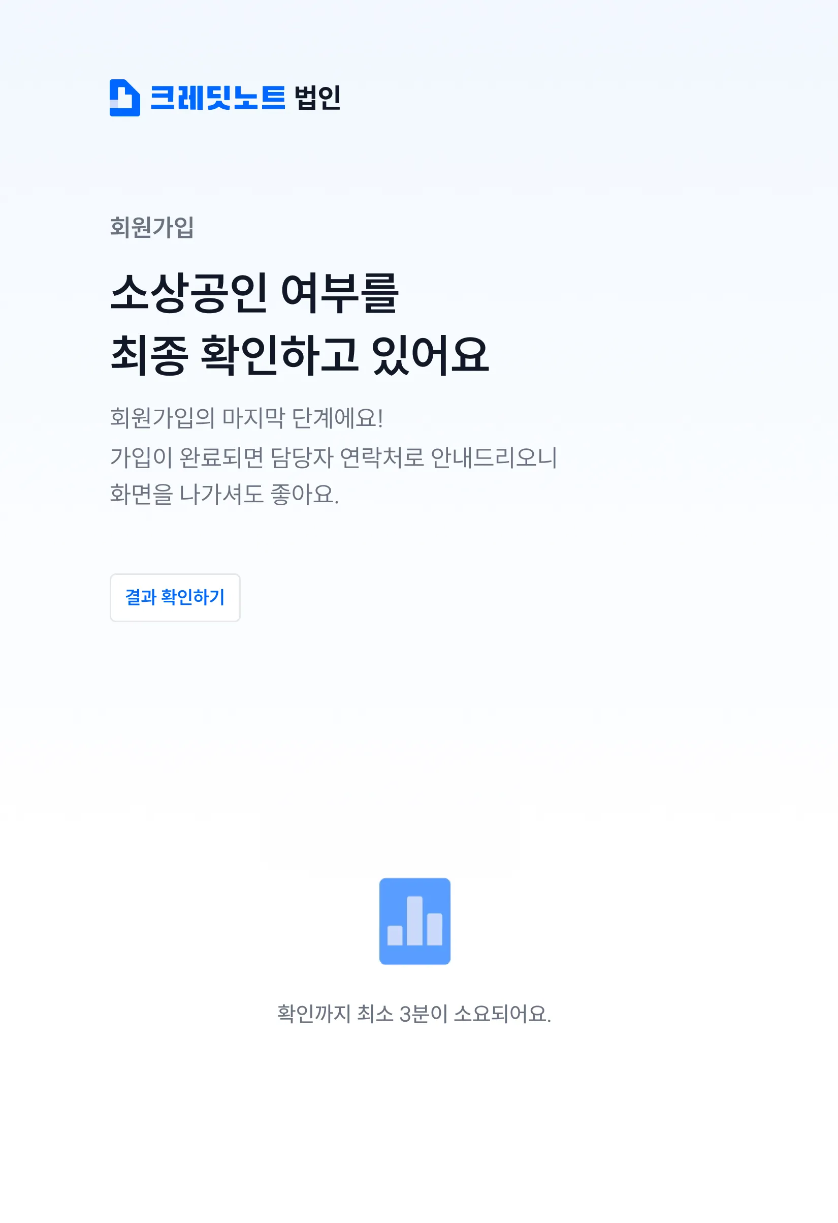 6. 모든 가입 정보를 입력하시면, 소상공인 법인 사업자에 해당하는지 확인하는 절차가 진행됩니다.