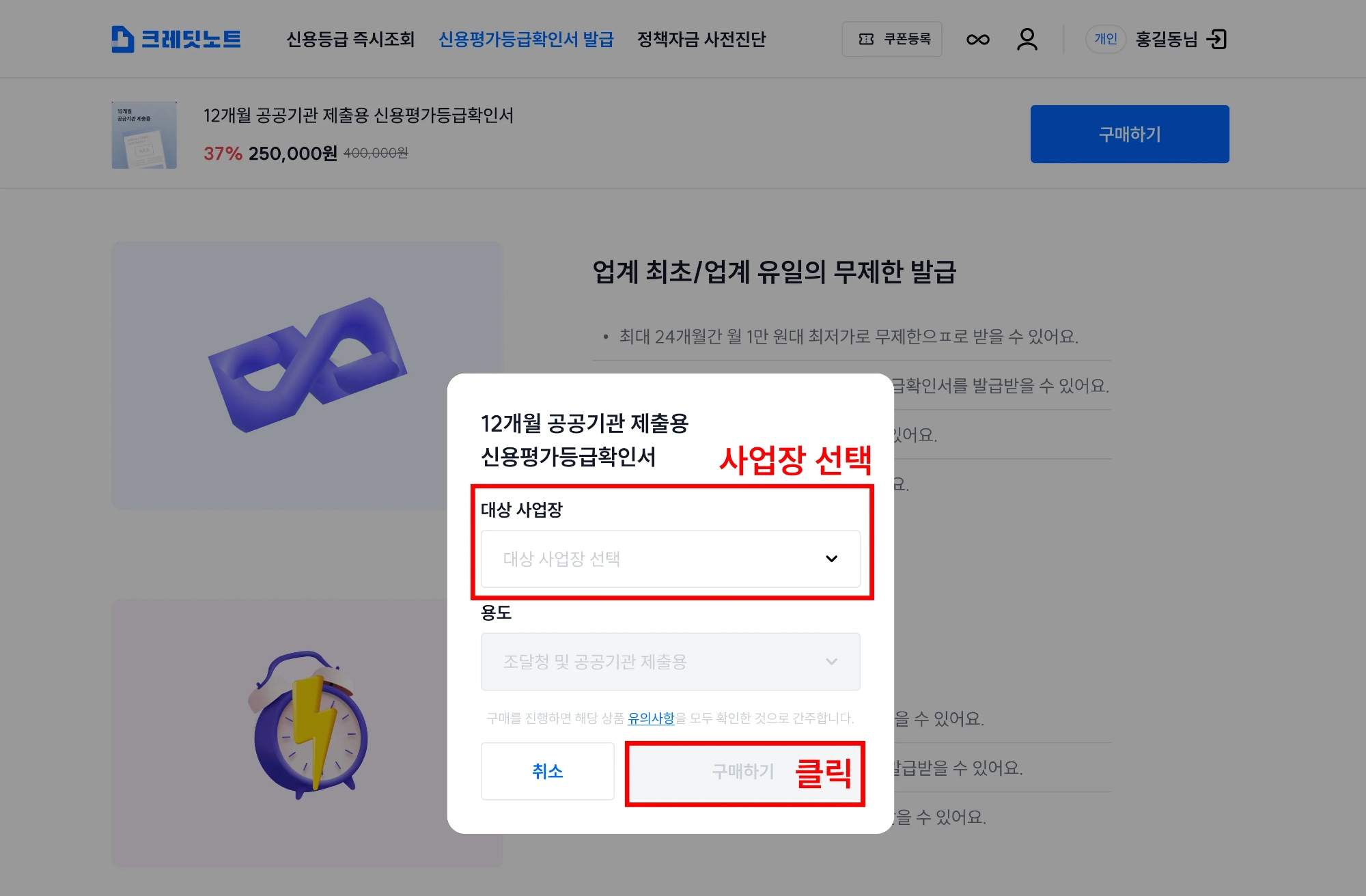 4. 등급확인서를 발급받고 싶은 사업장을 선택하신 후, 구매하기 버튼을 클릭해 주세요.