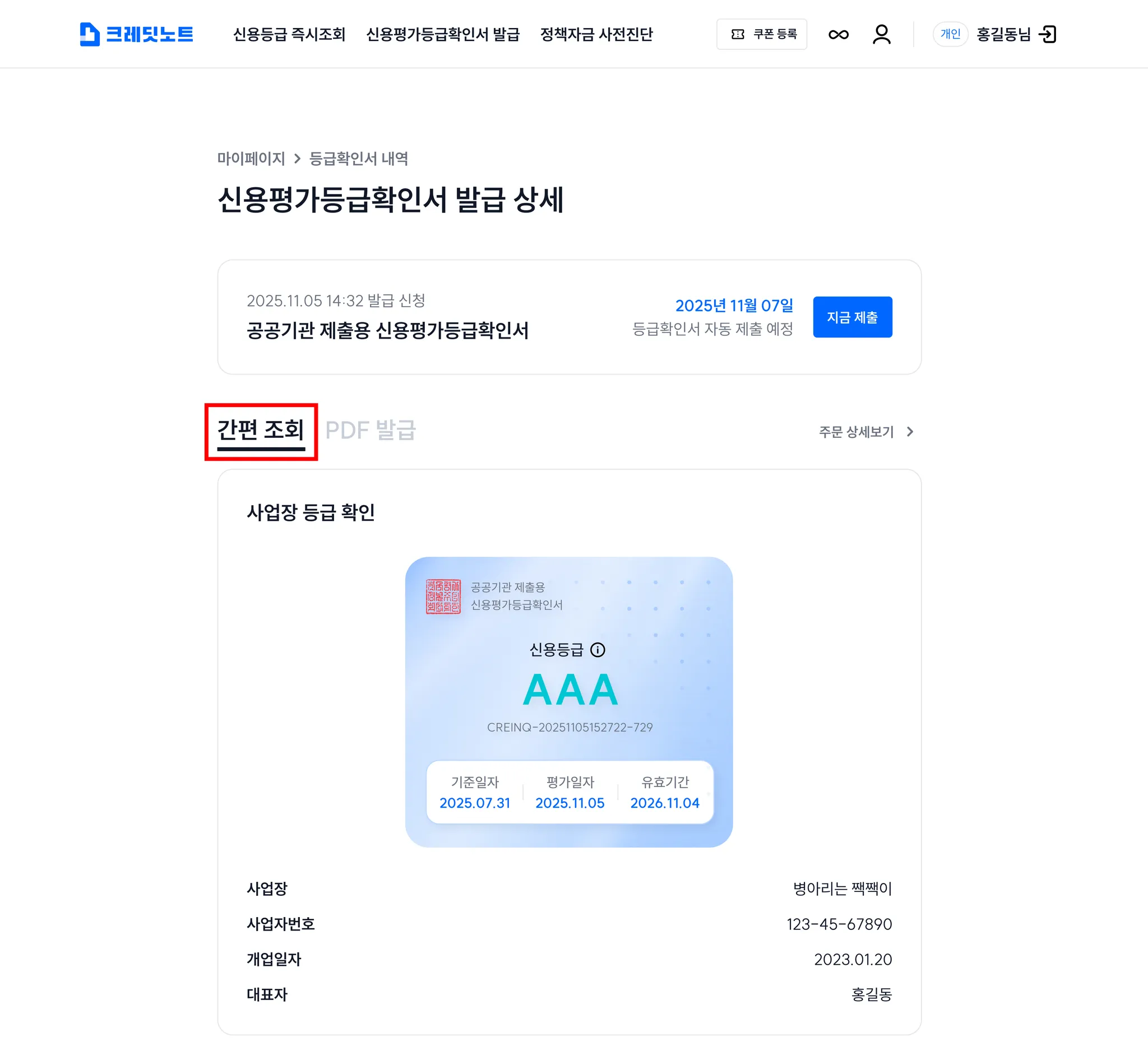 발급대기로 상태가 변경되어야 등급확인서를 발급할 수 있어요.