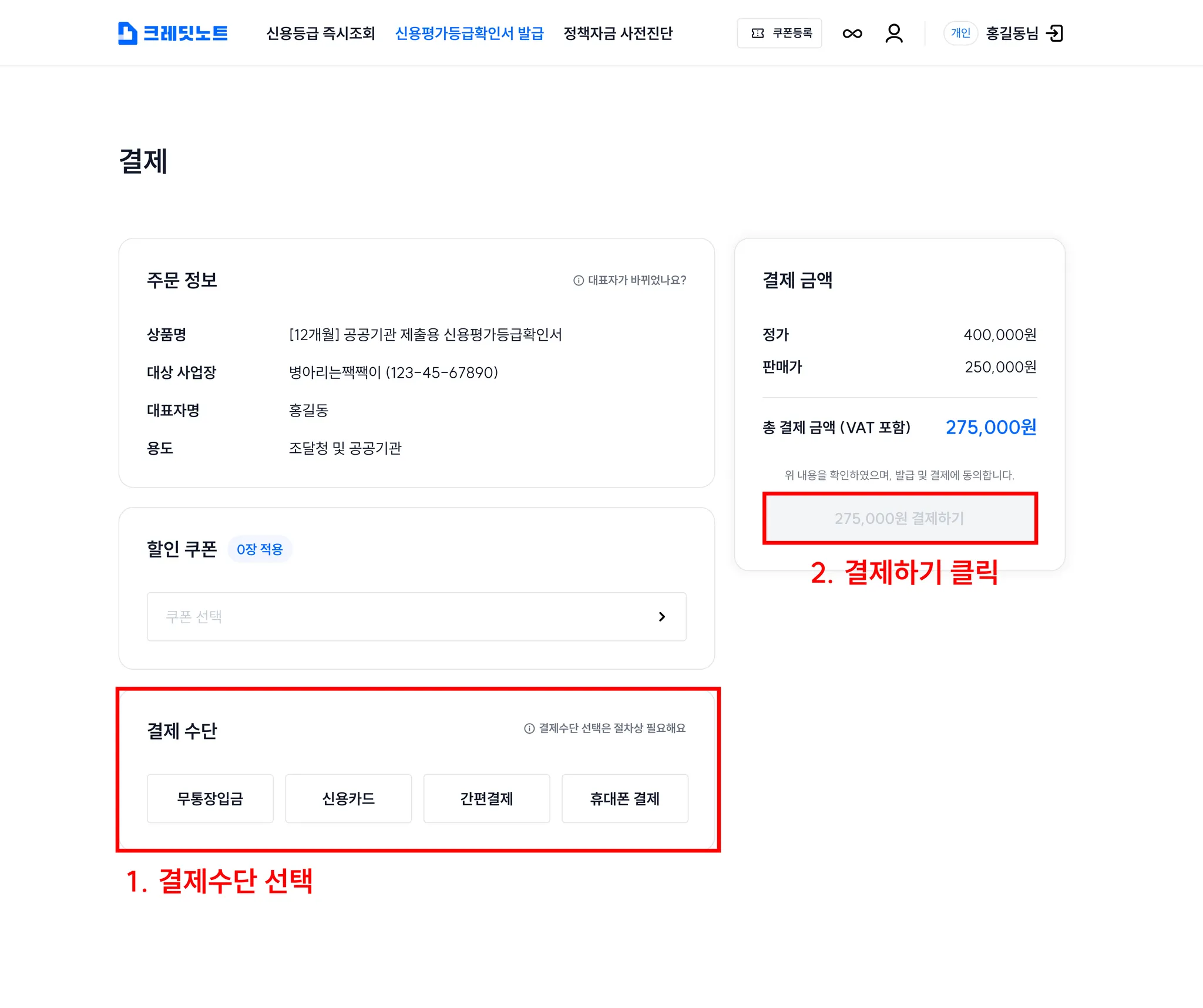 5. 원하는 결제수단을 선택한 뒤 결제하기 버튼을 클릭하여 결제를 진행해주세요.