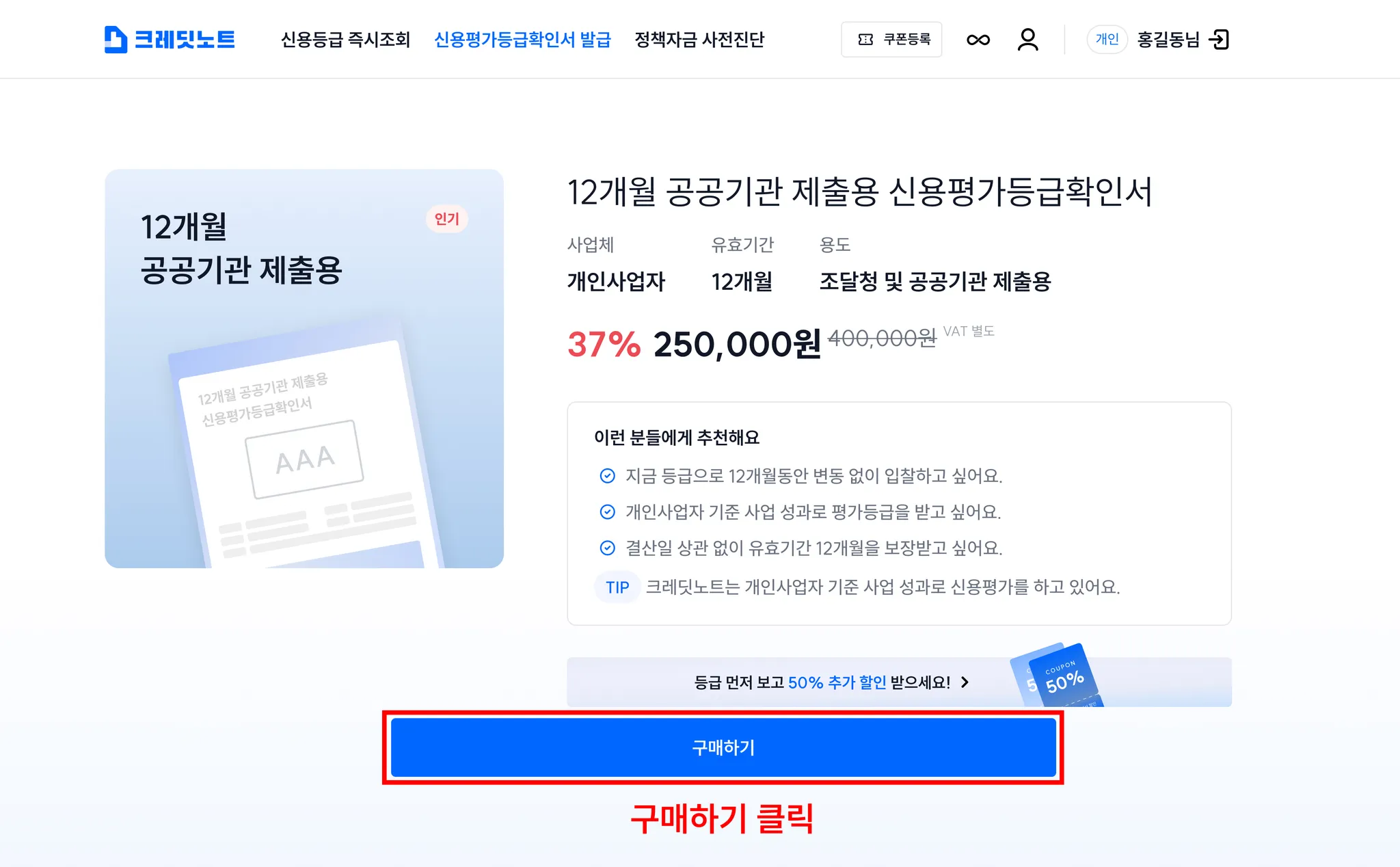 3. 등급확인서 상세페이지에서 구매하기 버튼을 클릭해주세요