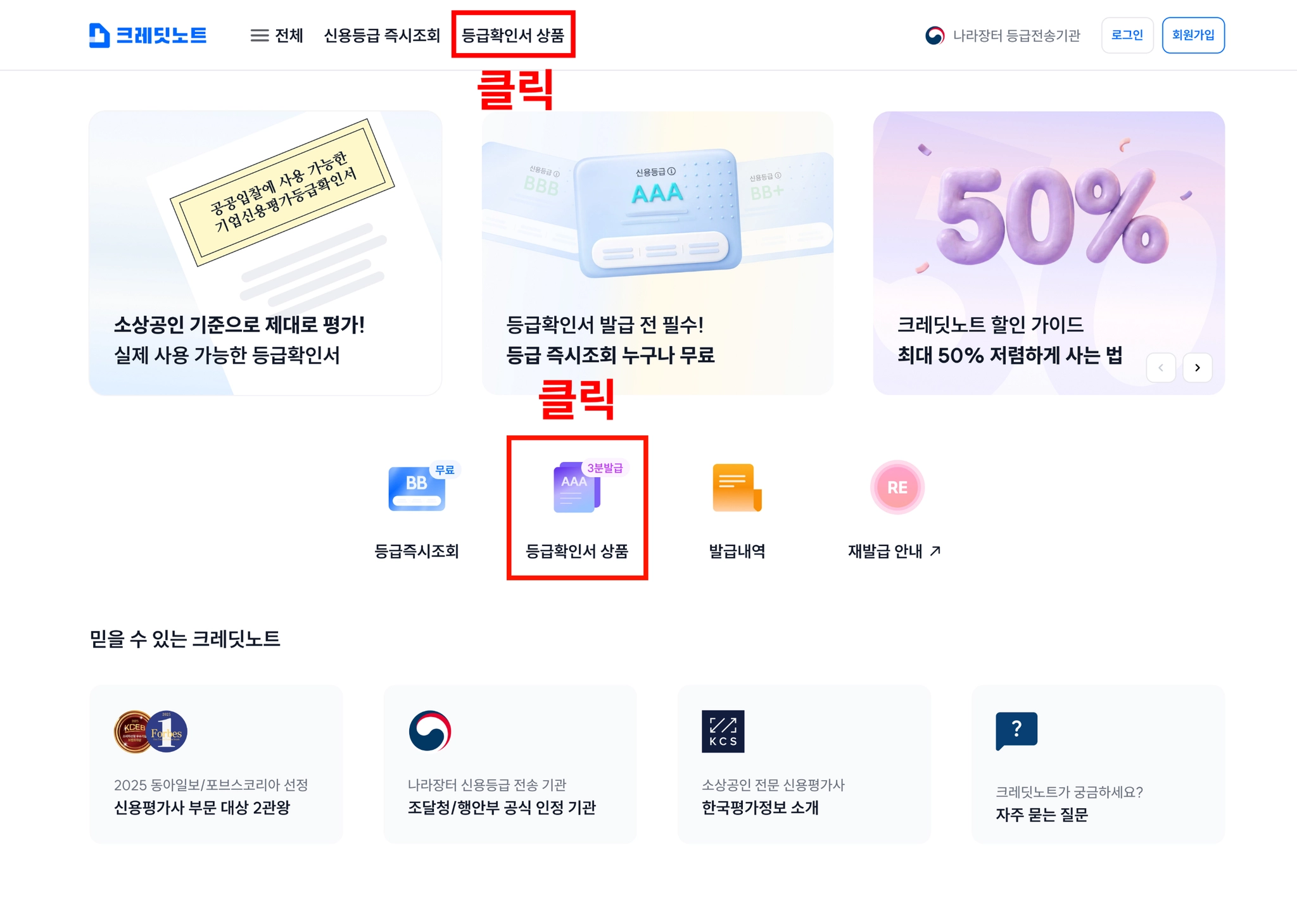 1. https://www.credit-note.co.kr/main 에 접속한 뒤 아래 두 곳 중 하나를 클릭해주세요.