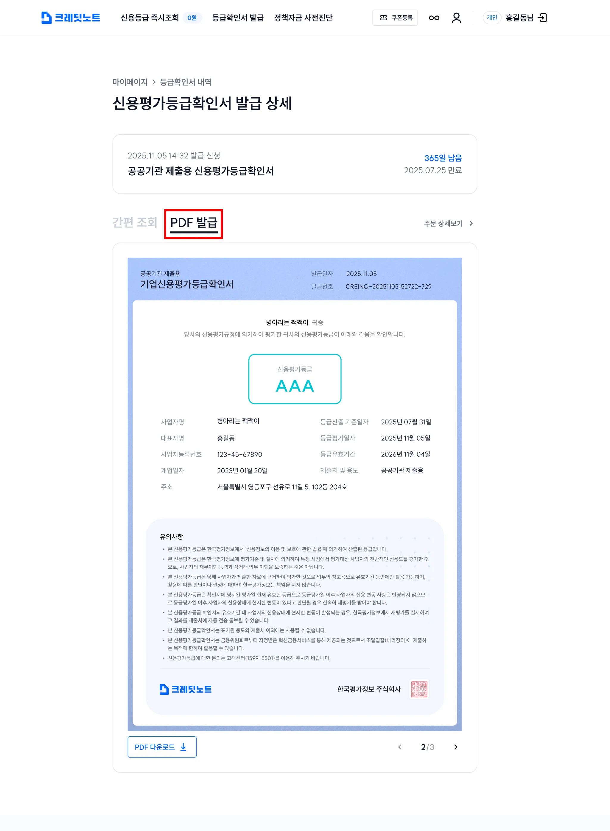 8. ‘간편조회’와 ‘PDF 발급’을 누르시면 신용평가등급확인서를 조회하고 제출, PDF 다운로드를 받을 수 있습니다.