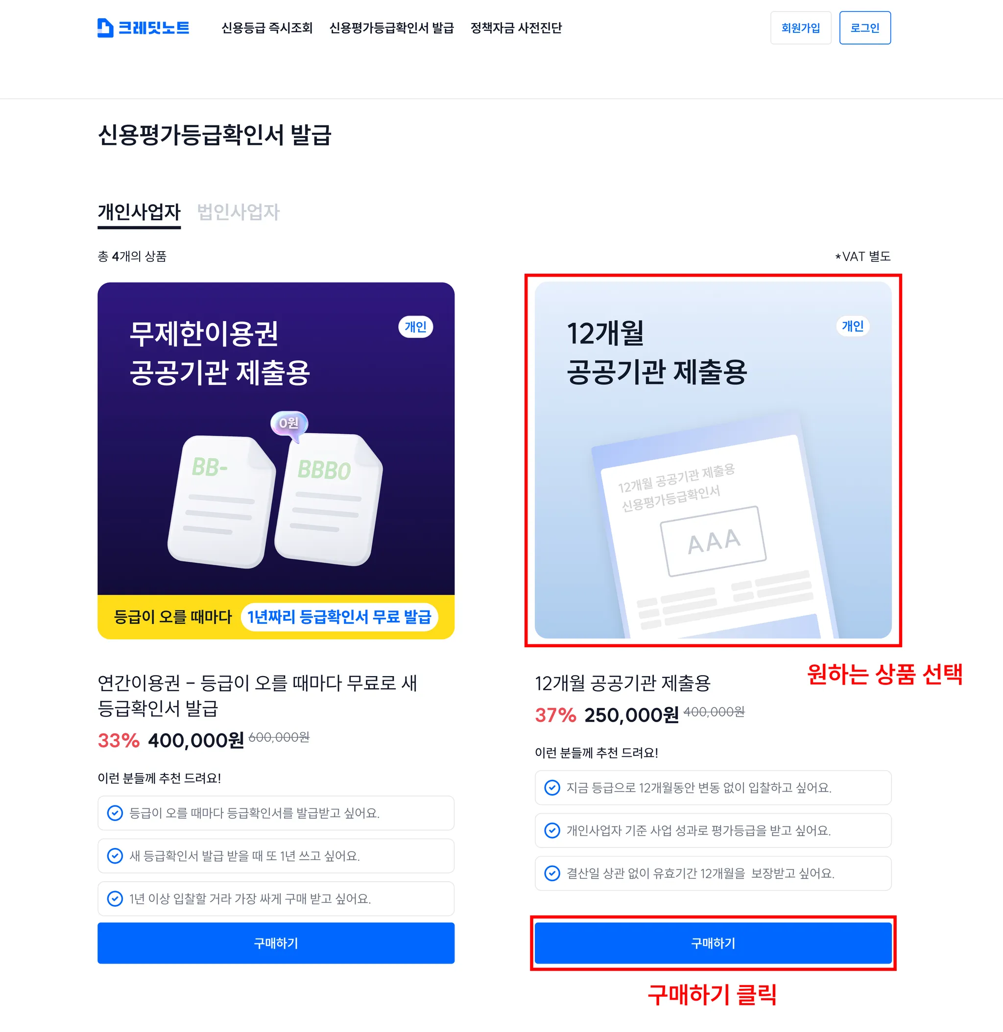 3. 등급확인서 상품 선택 페이지에서 원하는 상품을 선택해 주세요.