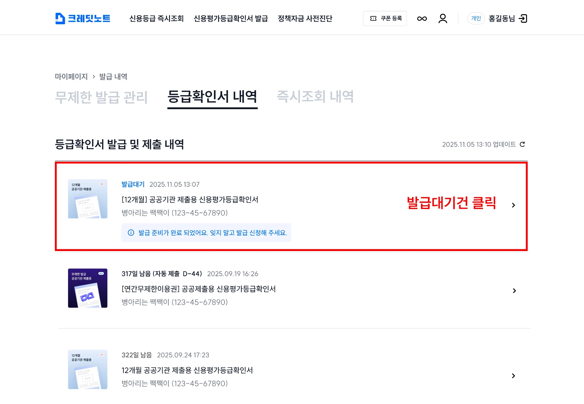 6. 결제가 완료되면 등급확인서 내역 페이지를 확인하실 수 있어요. 새로 추가된 등급확인서 발급대기건을 클릭해 주세요.