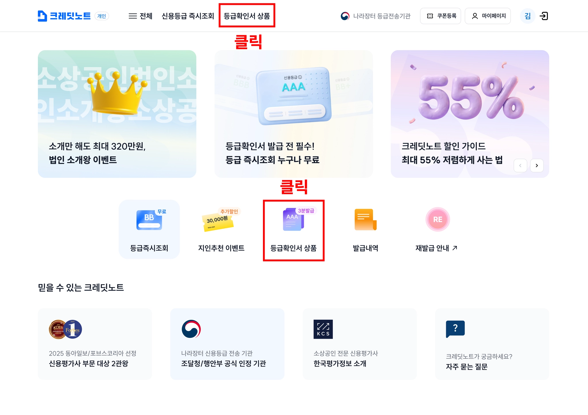 2. 상단 메뉴에서 ‘신용평가등급확인서 발급’을 클릭해 주세요.